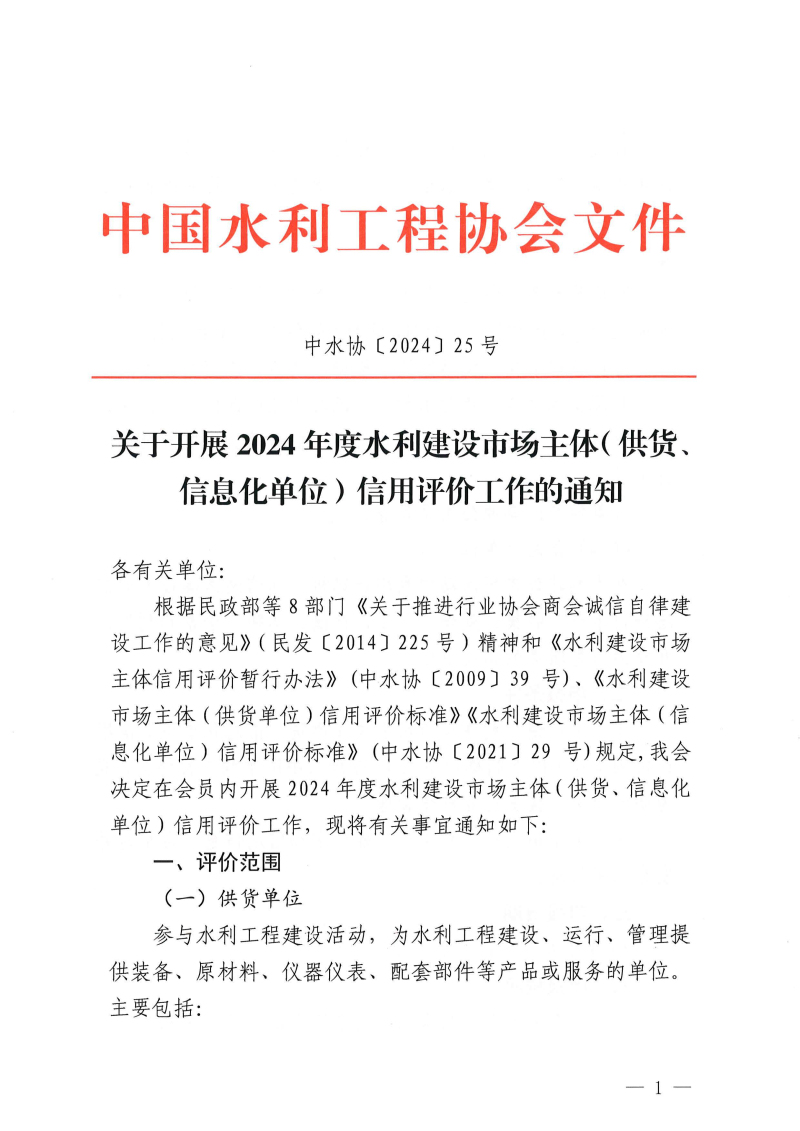 關于開展2024年度水利建設市場主體(供貨、信息化單位)信用評價工作的通知